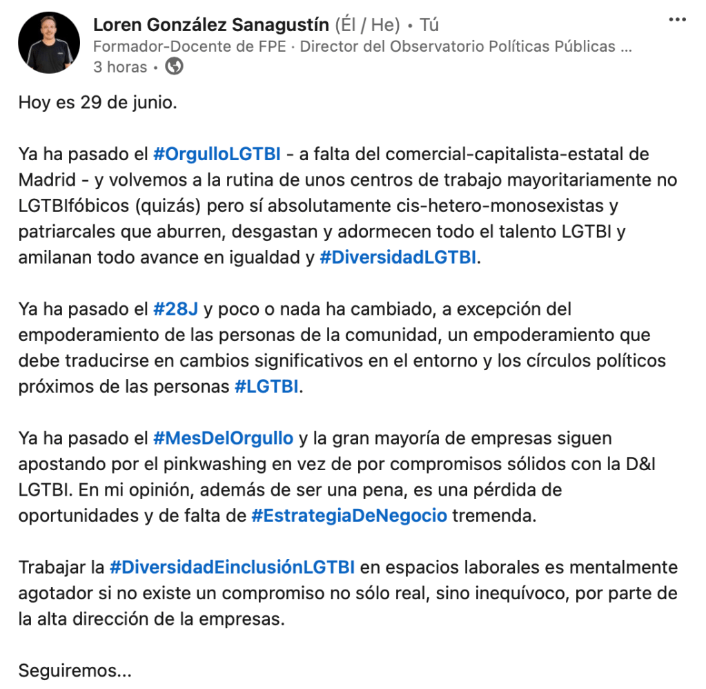 Y, es que, muchas empresas no entienden que no ser un espacio laboral LGTBIfóbico no las convierte en espacios inclusivos, igual que no ser un espacio racista no las convierte en empresas antirracistas. Así como otras muchas similitudes más de las que podríamos hablar hoy pero que me desviarían del tema.